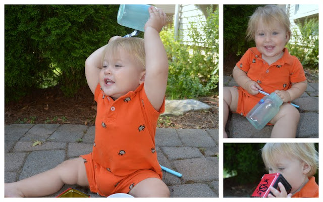 He went right for the spoons, laughing as he banged them together. Then he started to explore the containers. He held them up, rolled them around, and felt what they were made of (with his hands and, as usual, his mouth!).