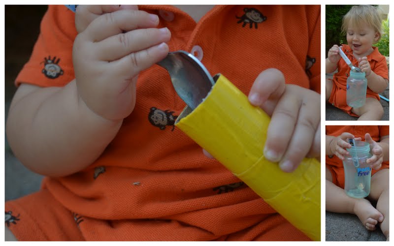 As so frequently happens, he then developed a new way to play, that hadn't occurred to me with this activity. He put the spoons into the containers, and dumped them out (or in the case of the tube, slid them through), working a little fine motor activity into our science fun!