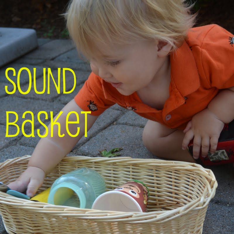 My one year old loves to bang on things - measuring cups in the tub, pots in the kitchen, spoons on the dinner table. I wanted to add a little twist to his fun to introduce the idea that different types of containers make different sounds, even when they are hit with the same object. To do this, I made a play basket for him with spoons for banging, and a couple of different objects to bang.